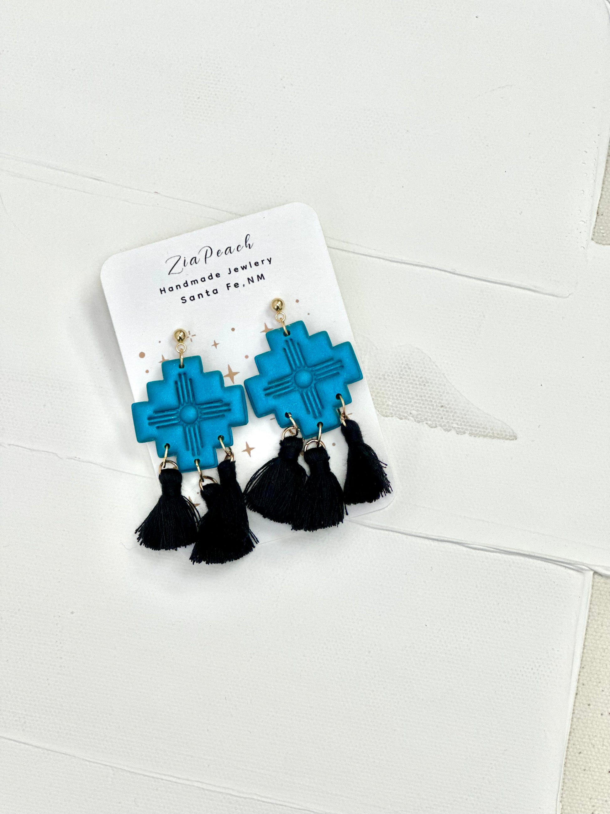 Zia stamped teal Aztecs with black tassels