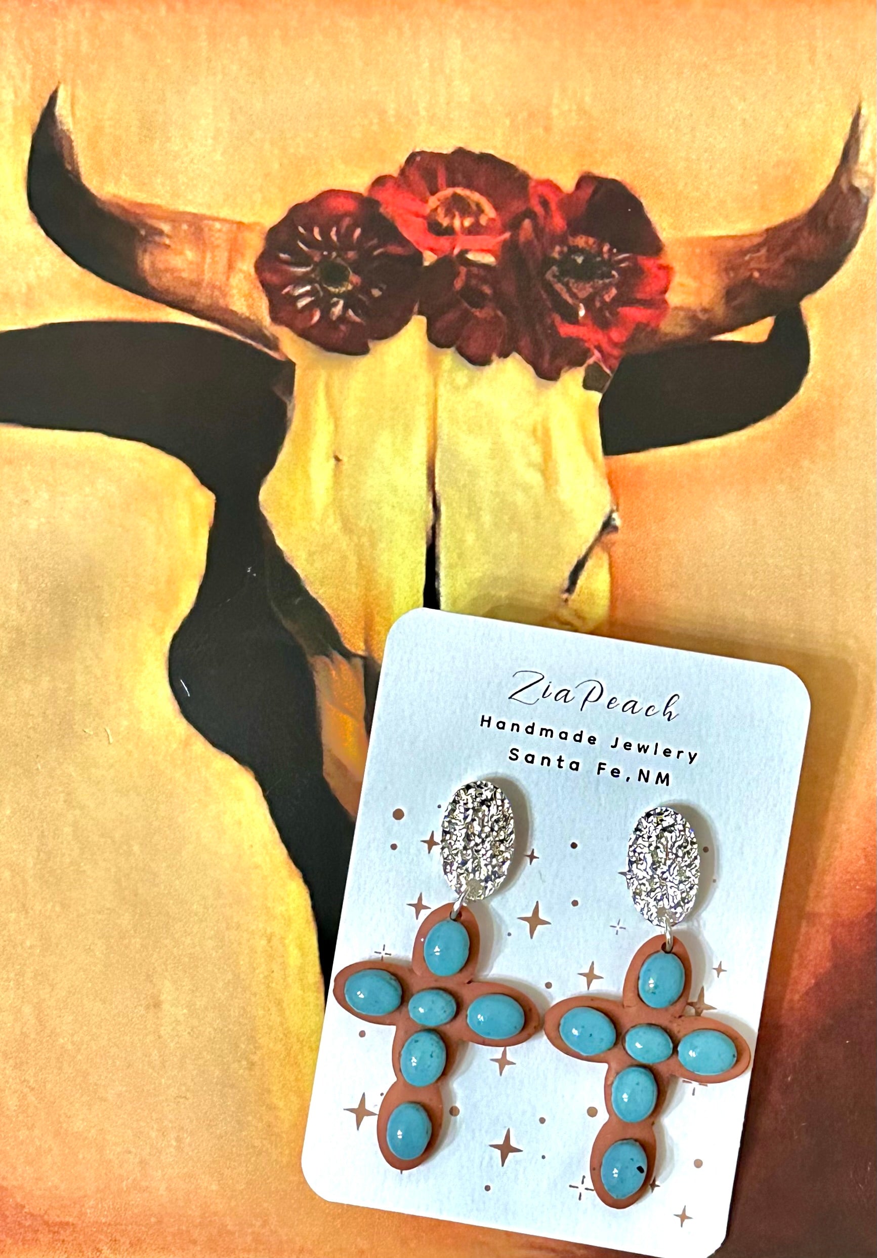Terra cotta cross dangles with faux turquoise stone onlays with textured silver oval stud