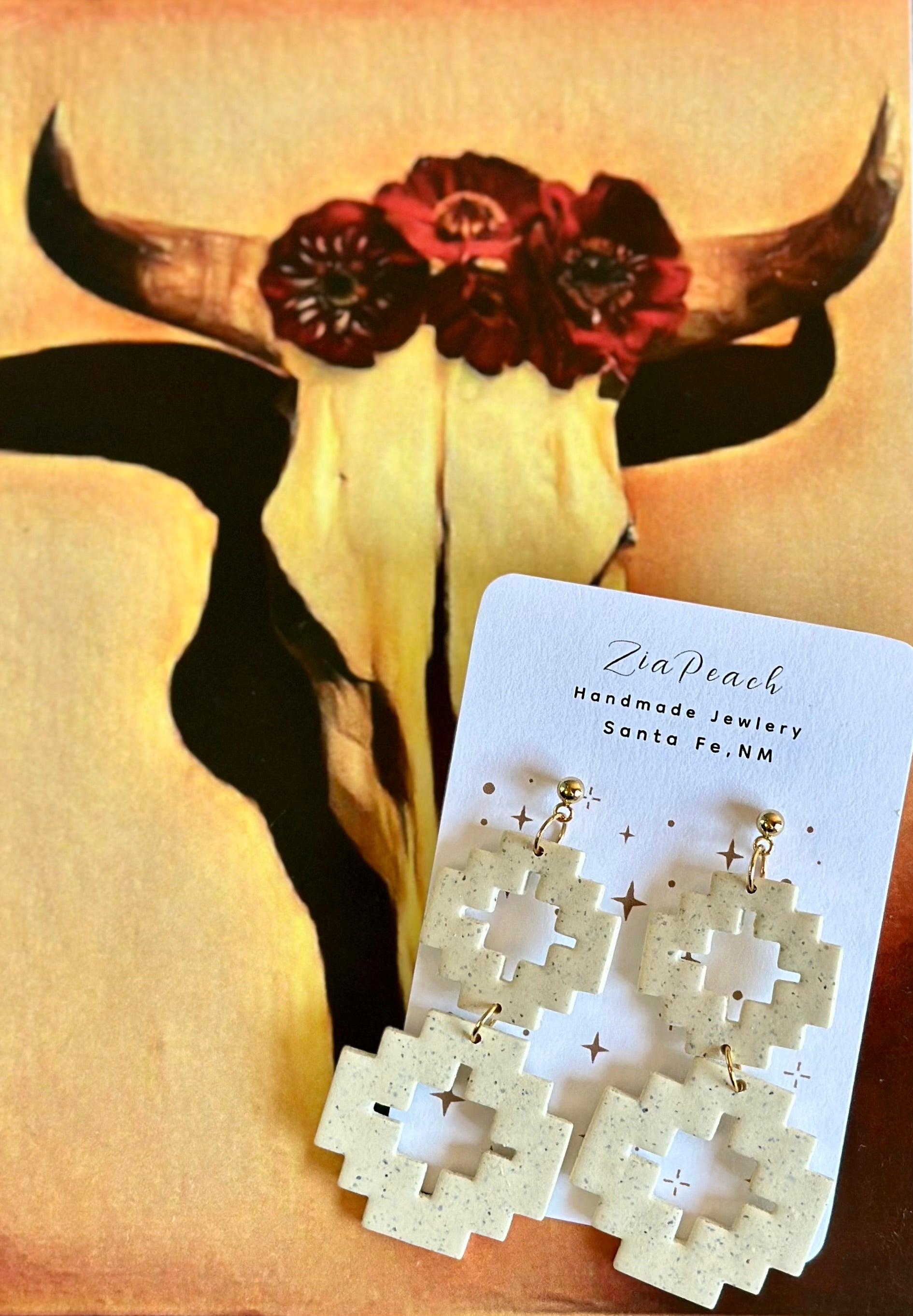 Long small with large Aztec dangles in speckled ivory. With gold plated stud